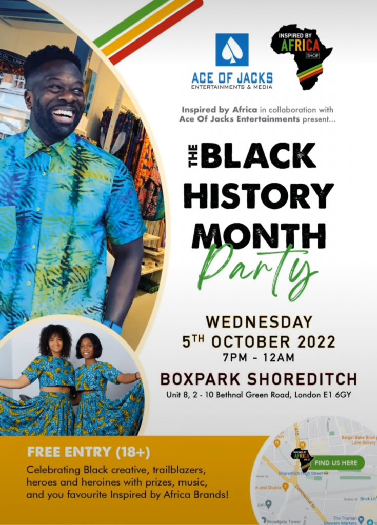 Inspired by Africa in collaboration with Ace Of Jacks Entertainments & Media presents the Black History Month Party at Boxpark Shoreditch. Taking place on Wednesday